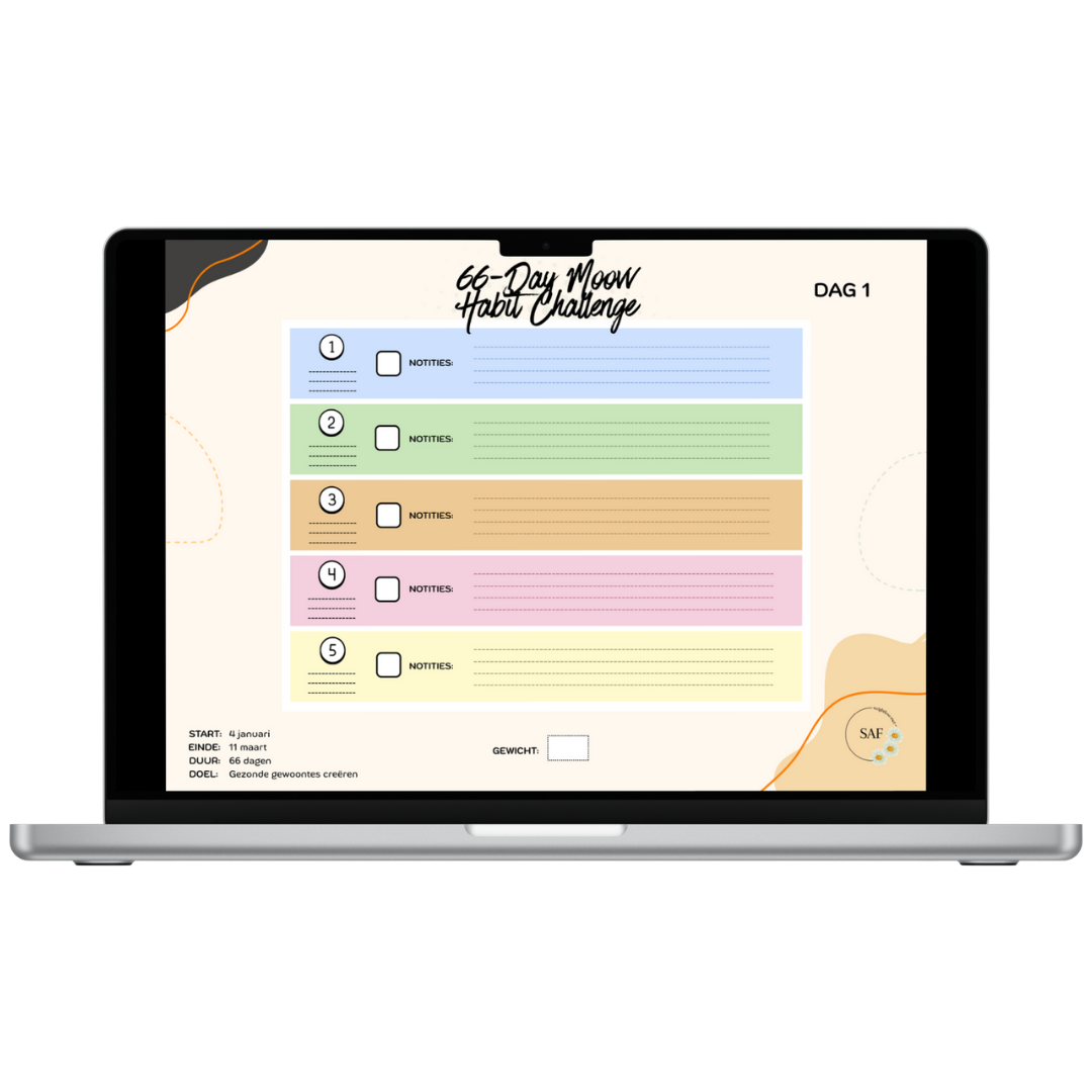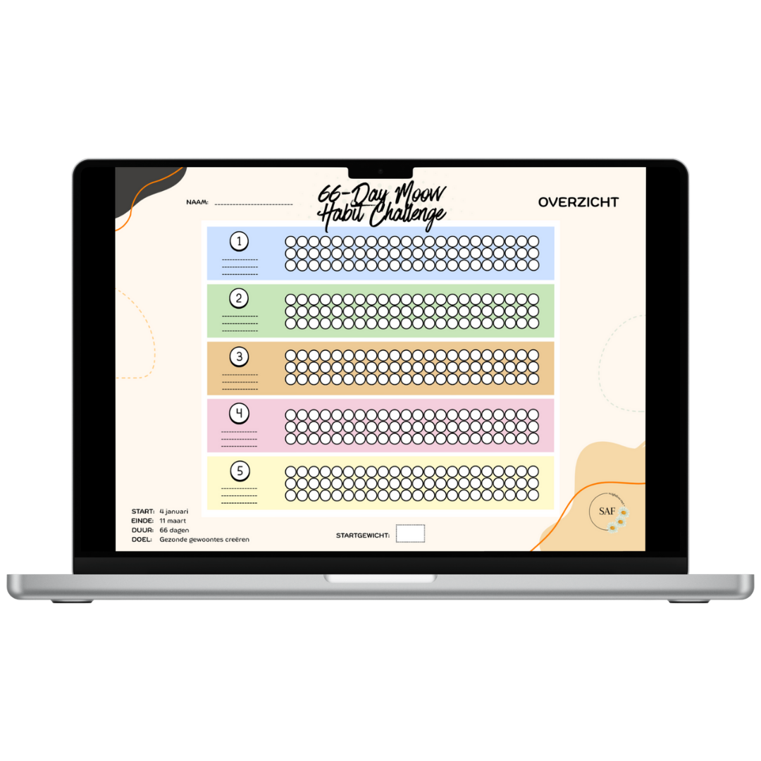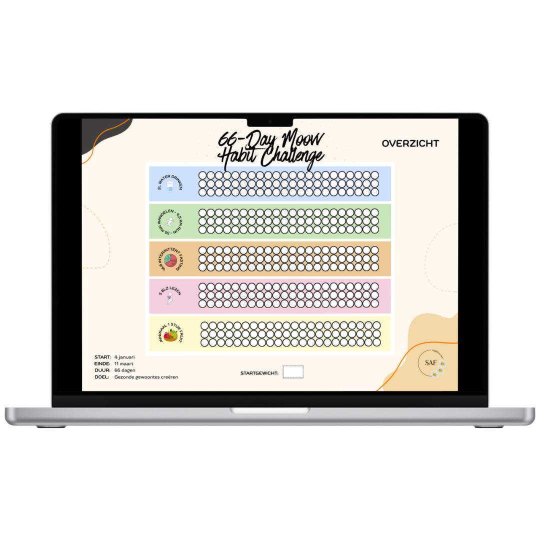 Dit is wat ik als minimum wil iedere dag, en meer mag natuurlijk altijd. Ik denk dat als ik dit de komende 66 dagen doe, dat dit een gewoonte gaat worden. Samen met mijn designer heb ik een planner gemaakt waarin ik mijn voortgang bij ga houden de komende 66 dagen. Deze planner heb ik nu ook beschikbaar gesteld voor jullie. Mocht je andere doelen willen stellen zoals een calorie tekort, sporten in de sportschool of bijvoorbeeld een specifiek eiwitdoel heb ik ook een algemenere planning beschikbaar gemaakt waar je je eigen doelen in kan opstellen. Deze planner is geheel GRATIS